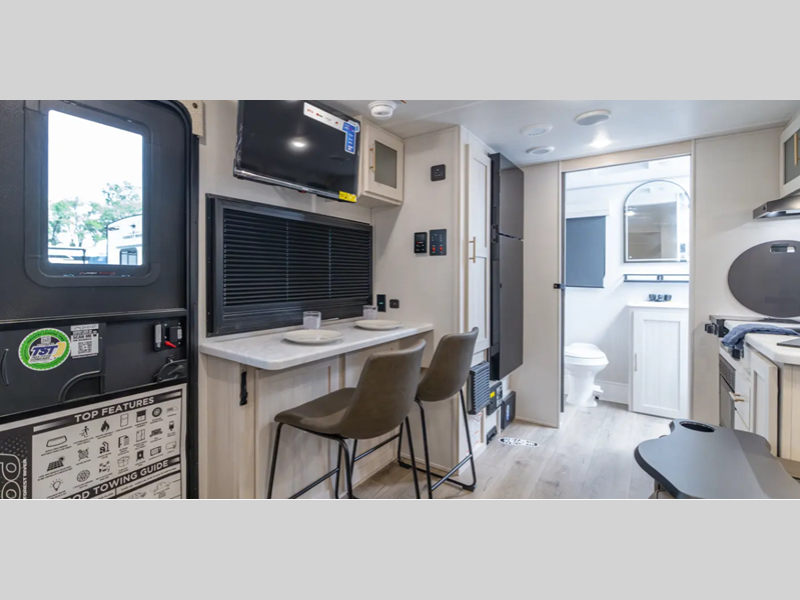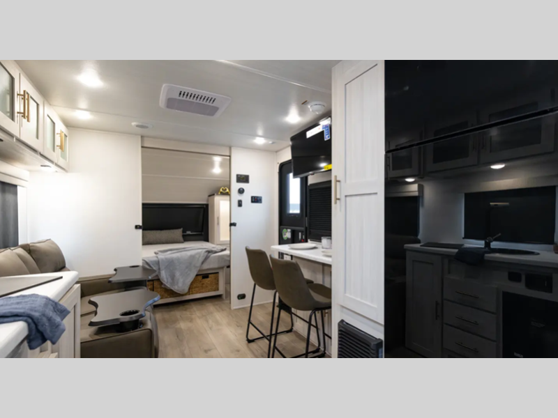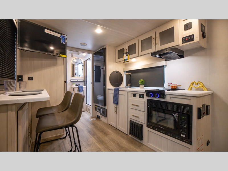 Sleeps 3 Slides 1 Length 20 ft Ext Width 8 ft Ext Height 9 ft 10 in Hitch Weight 385 lbs Dry Weight 2974 lbs Cargo Capacity 1811 lbs Fresh Water Capacity 30 gals Grey Water Capacity 30 gals Black Water Capacity 30 gals Available Beds Queen Refrigerator Type 12V Black Glass Convection Cooking Yes Cooktop Burners 2 Number of Awnings 1 Water Heater Type Tankless AC BTU 15000 btu TV Info 12V TV Awning Info 8' Power Axle Count 1 Shower Type Neo-Angled Electrical Service 30 amp Similar Floorplans