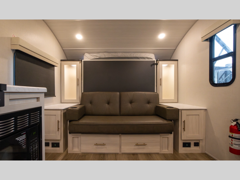 Sleeps 3 Length 22 ft 2 in Ext Width 8 ft Ext Height 10 ft 4 in Hitch Weight 385 lbs Dry Weight 3649 lbs Cargo Capacity 1136 lbs Fresh Water Capacity 30 gals Grey Water Capacity 30 gals Black Water Capacity 30 gals Available Beds Murphy Refrigerator Type 12V Black Glass Convection Cooking Yes Cooktop Burners 2 Number of Awnings 1 Water Heater Type Tankless AC BTU 15000 btu TV Info 12V TV Awning Info 11' Power Axle Count 1 Shower Type Standard Similar Floorplans